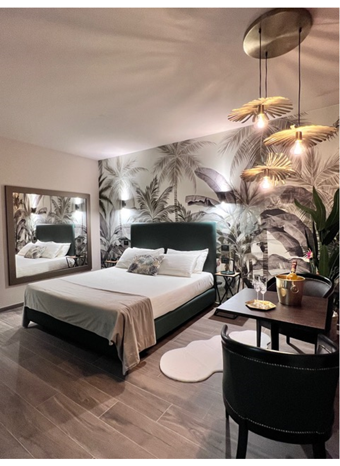 Discover the Eden Suite, an exclusive oasis where relaxation and passion meet in a unique atmosphere. Private and refined, the suite welcomes you with luxurious, exotic details designed for your well-being: a private spa area, a sensory shower, and a relaxing whirlpool bath, surrounded by soft lighting that creates a paradisiacal setting.